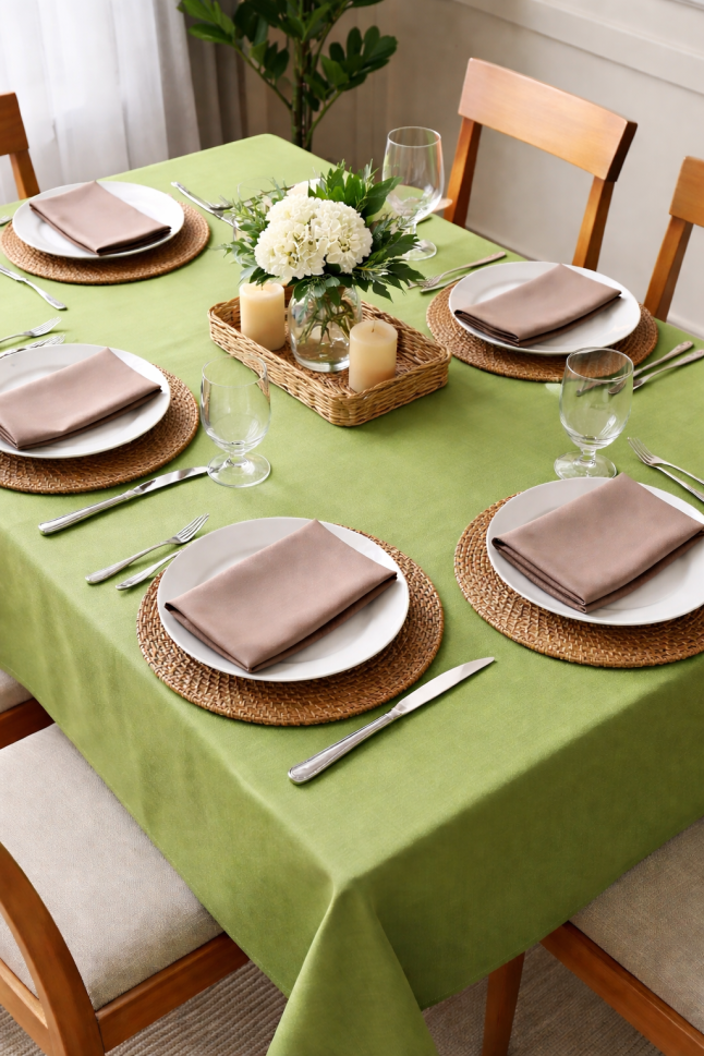 Зелена покривка с кафяви салфетки - стил и уют за вашата трапеза!