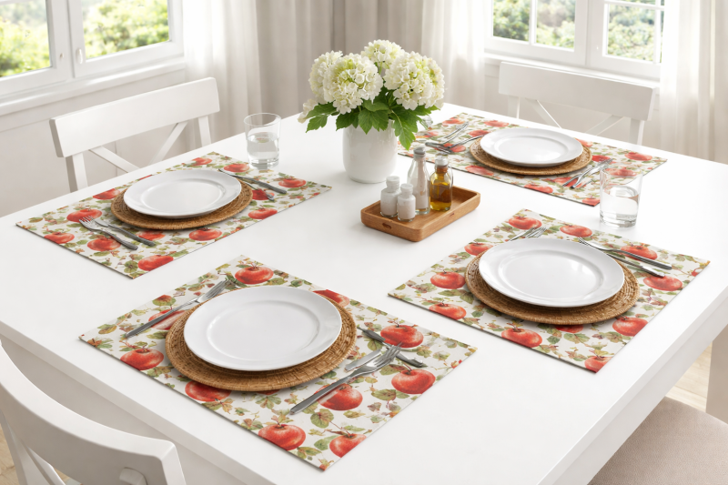 Стилен сет от 4 подложки за хранене с красив десен на червени ябълки. Декорът придава уют и естествено настроение на всяка кухня или трапезария.